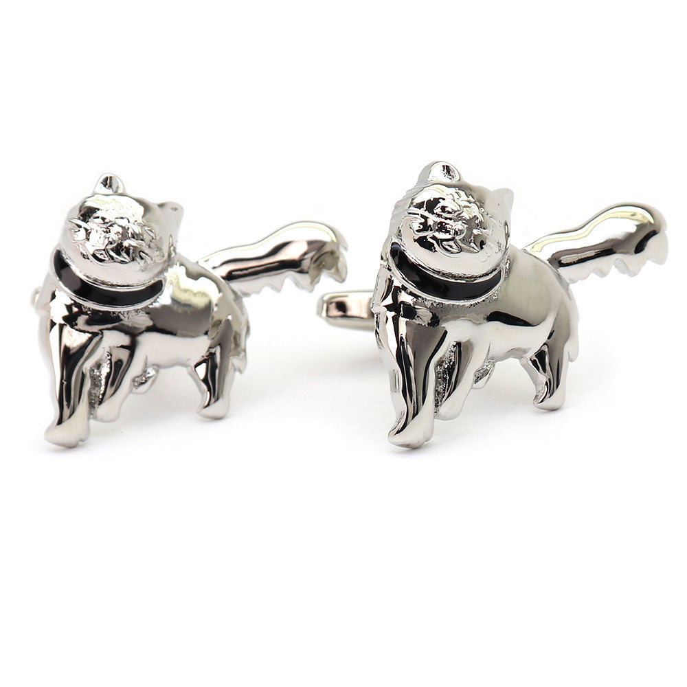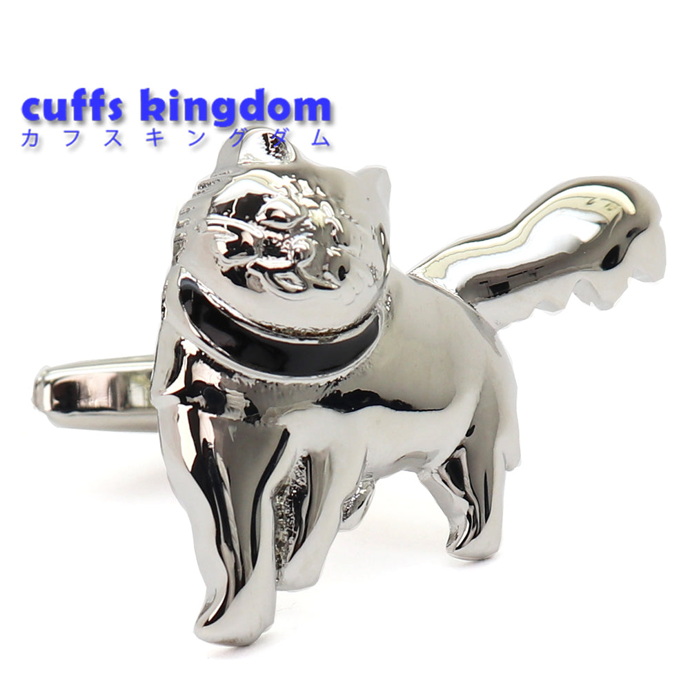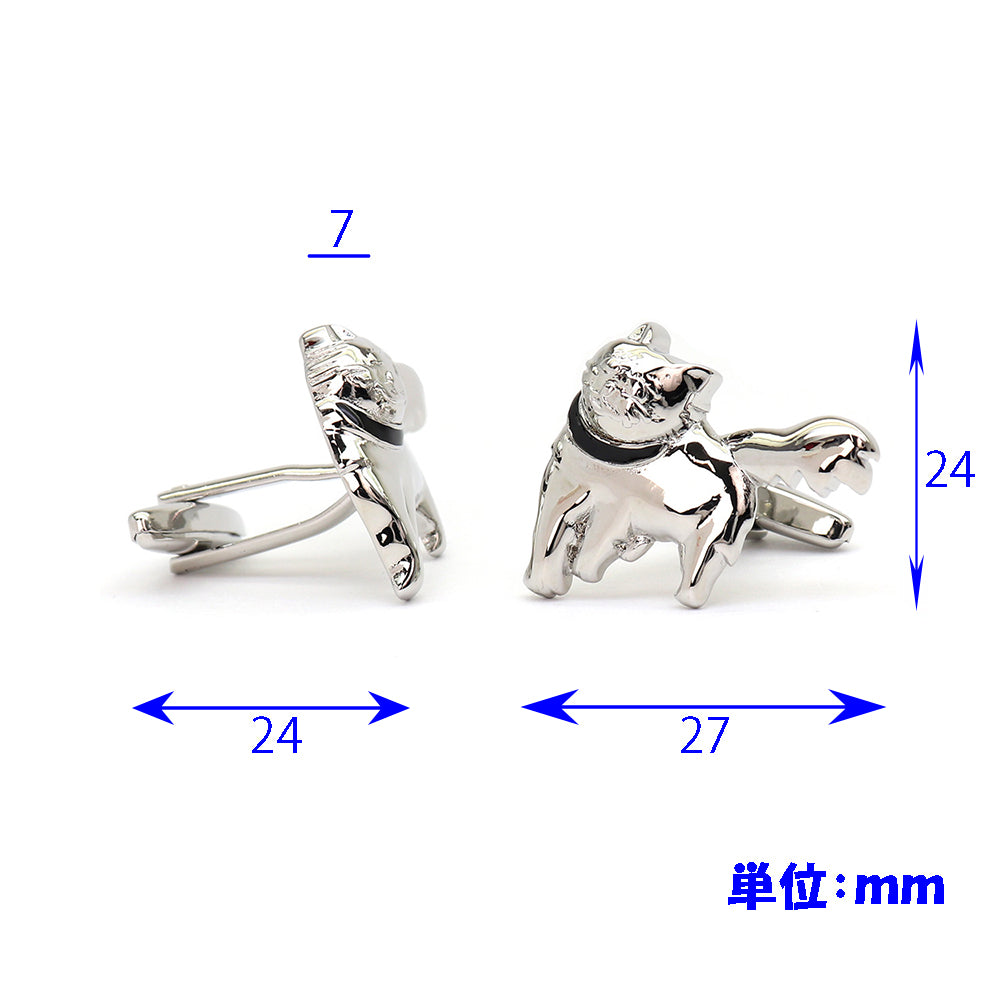 このカフスボタンは、洗練されたデザインと個性的なスタイルを兼ね備えたアクセサリーです。猫をモチーフにした独特の形状で、細部にわたる精巧な仕上がりが特徴です。光沢のある銀色の仕上げが、どんなドレスシャツにも上品なアクセントを加えます。