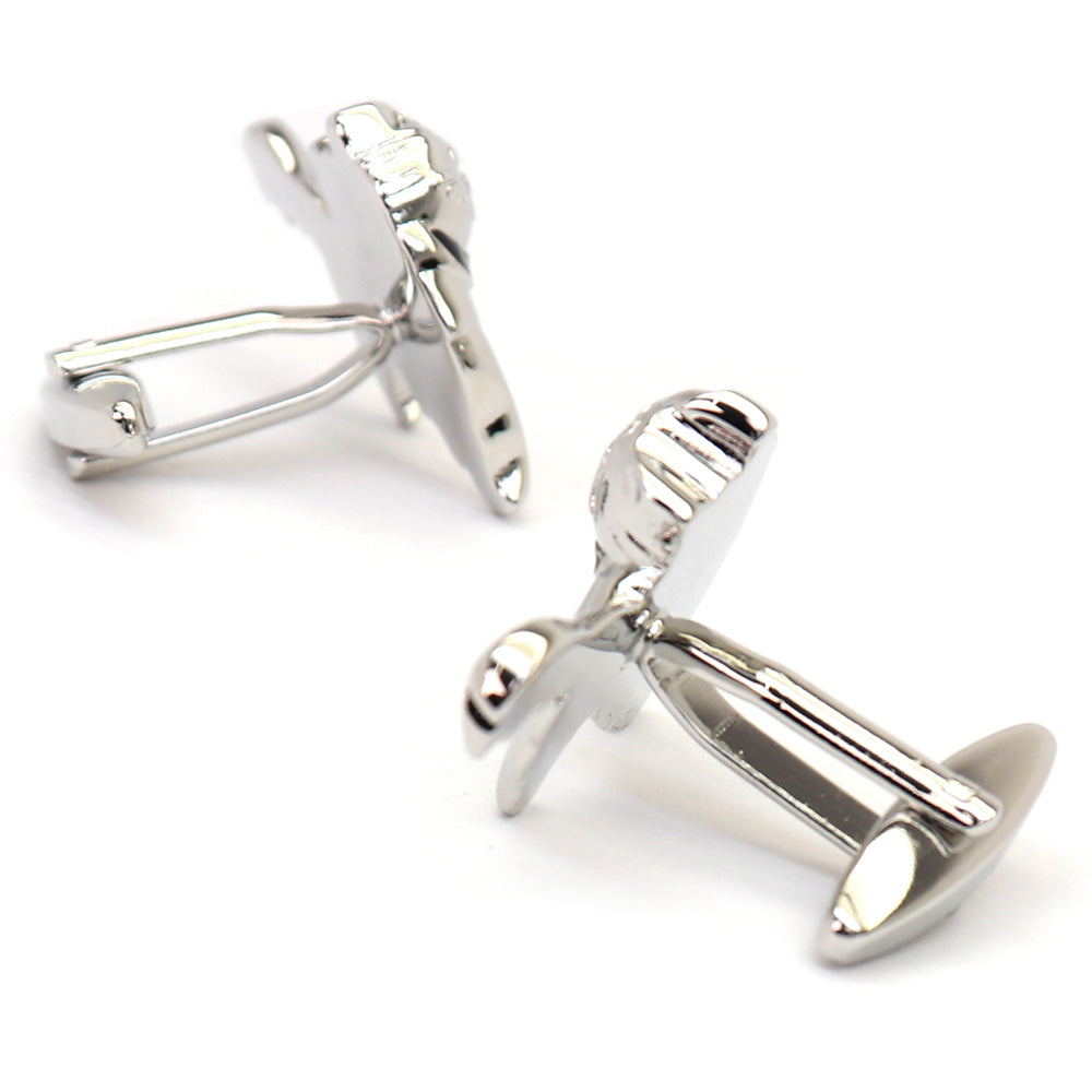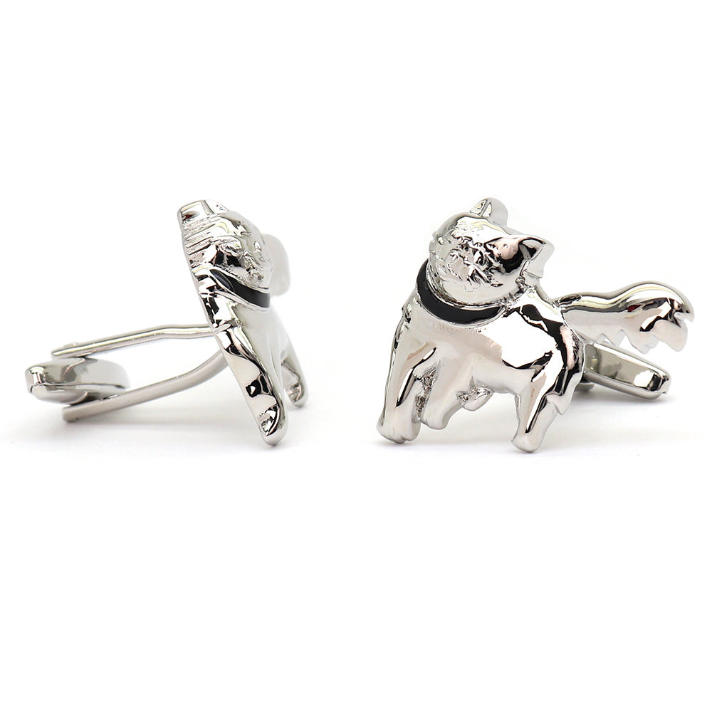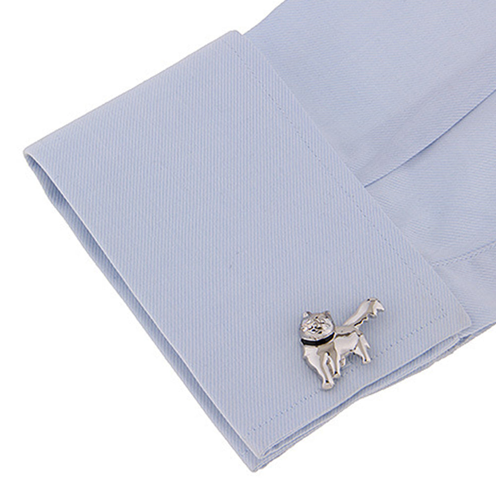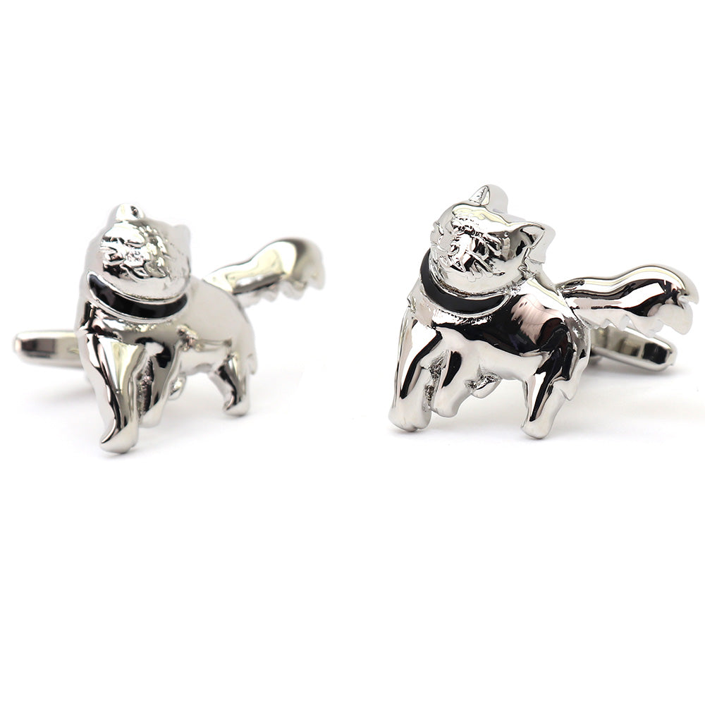 このカフスボタンは、洗練されたデザインと個性的なスタイルを兼ね備えたアクセサリーです。猫をモチーフにした独特の形状で、細部にわたる精巧な仕上がりが特徴です。光沢のある銀色の仕上げが、どんなドレスシャツにも上品なアクセントを加えます。