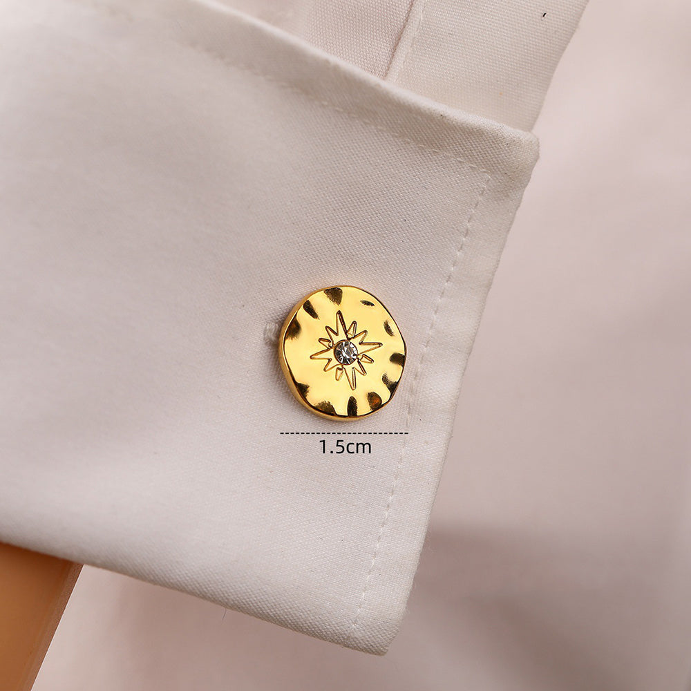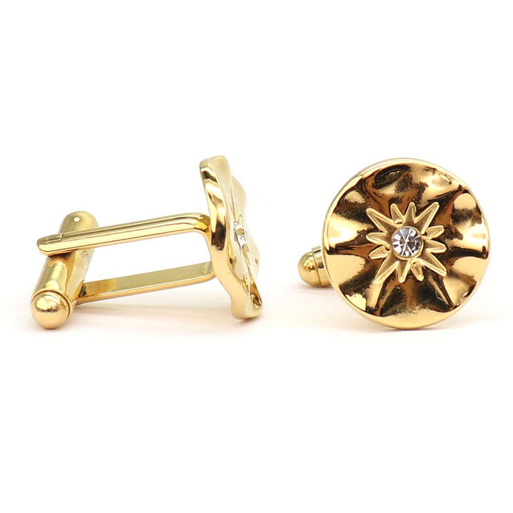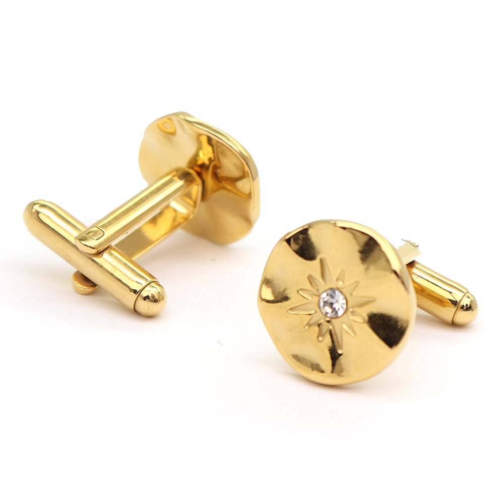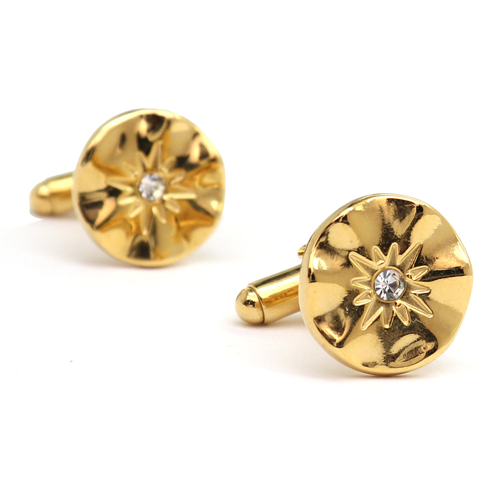 このカフスボタンは、洗練されたデザインと上質な素材で、あなたのスーツスタイルを一層引き立てます。ゴールドのベースにエレガントな花模様が施され、中央に輝くクリスタルがアクセントとなっています。特別な日の装いに華を添えるだけでなく、ビジネスシーンでの印象も格上げします。