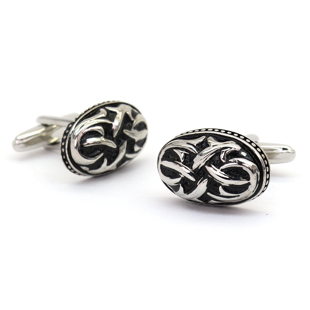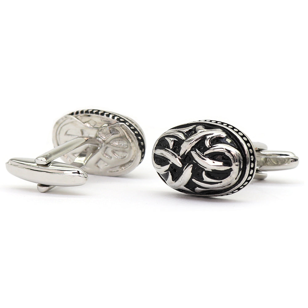 このカフスボタンは、洗練されたデザインと卓越した職人技が際立つアイテムです。繊細な彫刻が施されたシルバー仕上げで、どんなドレスシャツにも上品なアクセントを加えます。そのユニークな模様は、個性を表現しながらも洗練されたスタイルを保ちたい方に最適です。