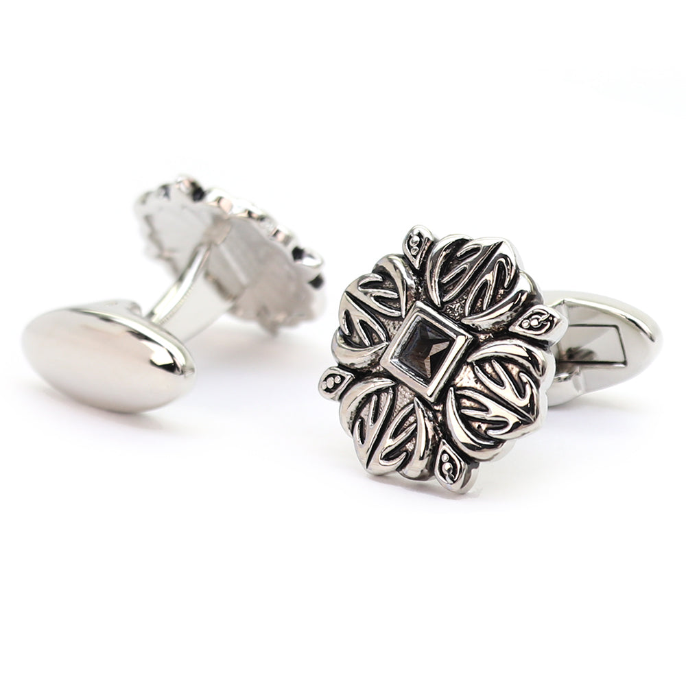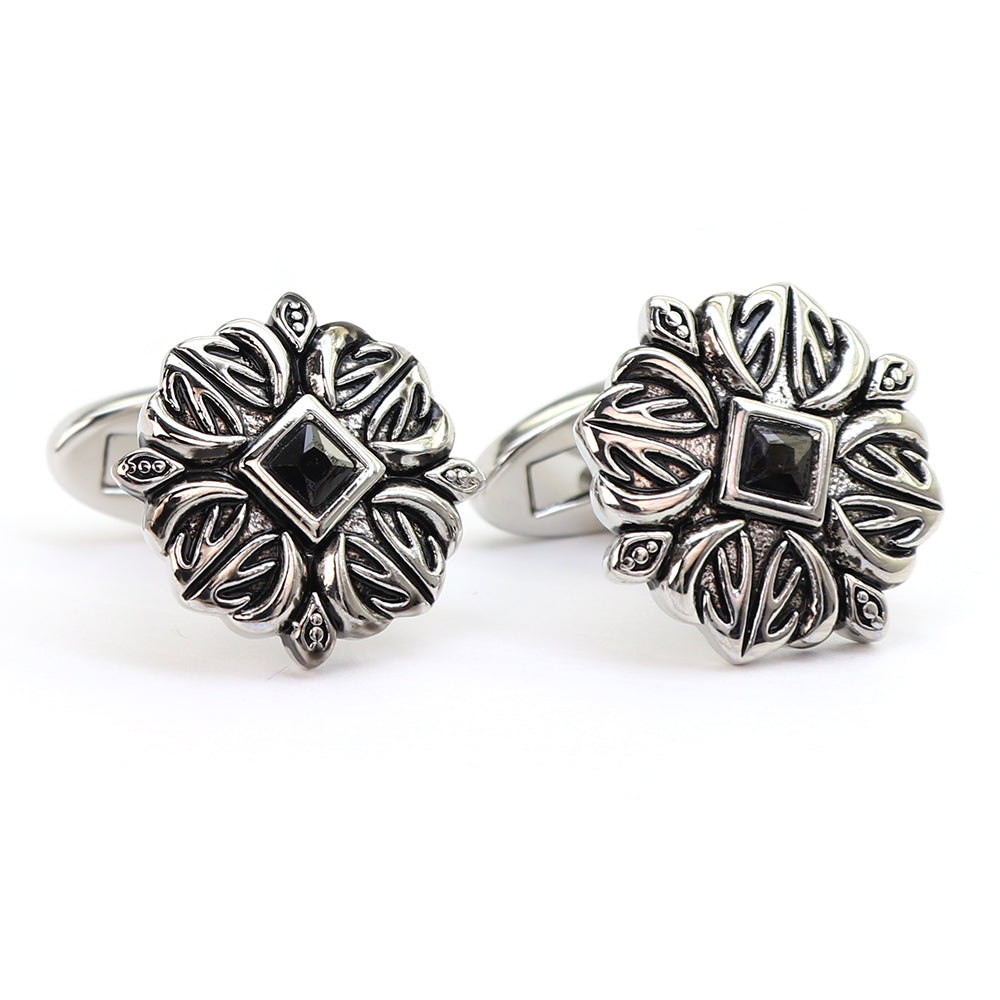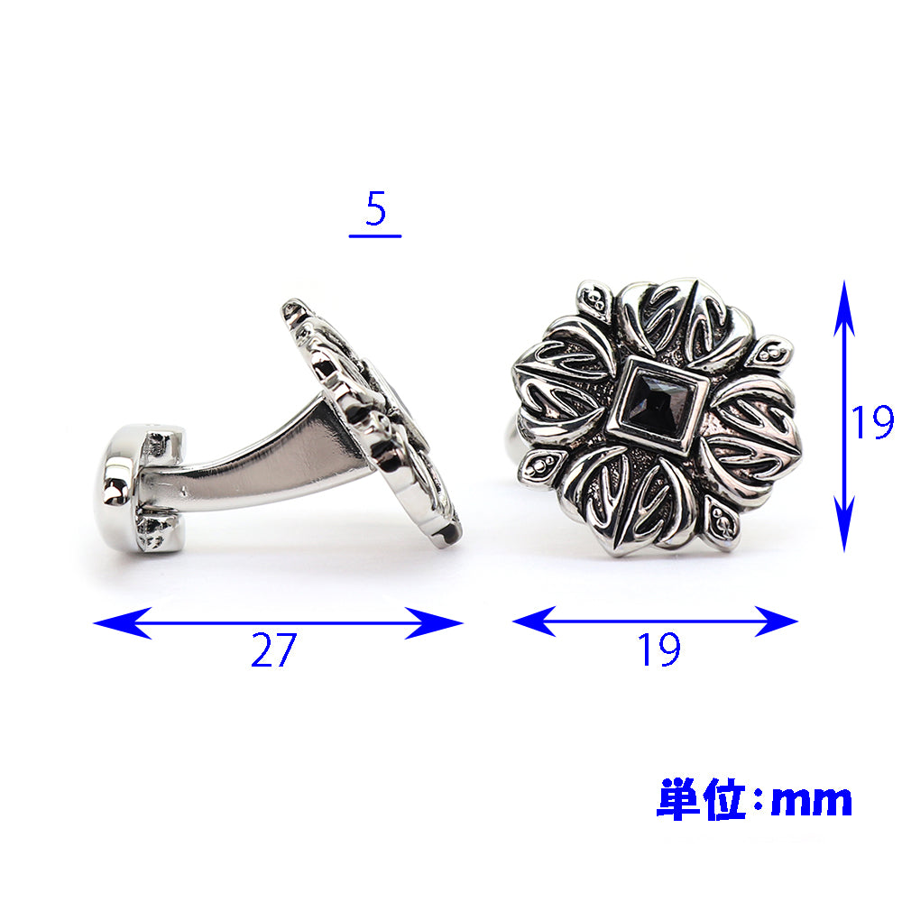 このカフスボタンは、その独特なデザインと高級感で、特別な日の装いを一層引き立てます。中央に配された黒い宝石が、複雑に彫られた銀色の模様と調和し、洗練された印象を与えます。ビジネスシーンはもちろん、結婚式やパーティーなどのフォーマルな場にも最適です。