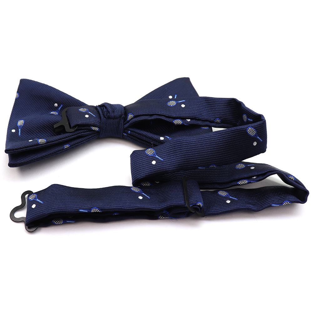 この蝶ネクタイは、洗練されたデザインと上品な色合いで、あらゆるフォーマルな場面に最適です。深みのあるネイビーブルーの生地に、テニスラケットとボールのモチーフが散りばめられており、スポーツを愛する方には特におすすめのアイテムです。このユニークなデザインは、会話のきっかけとなり、周囲の注目を集めること間違いなしです。