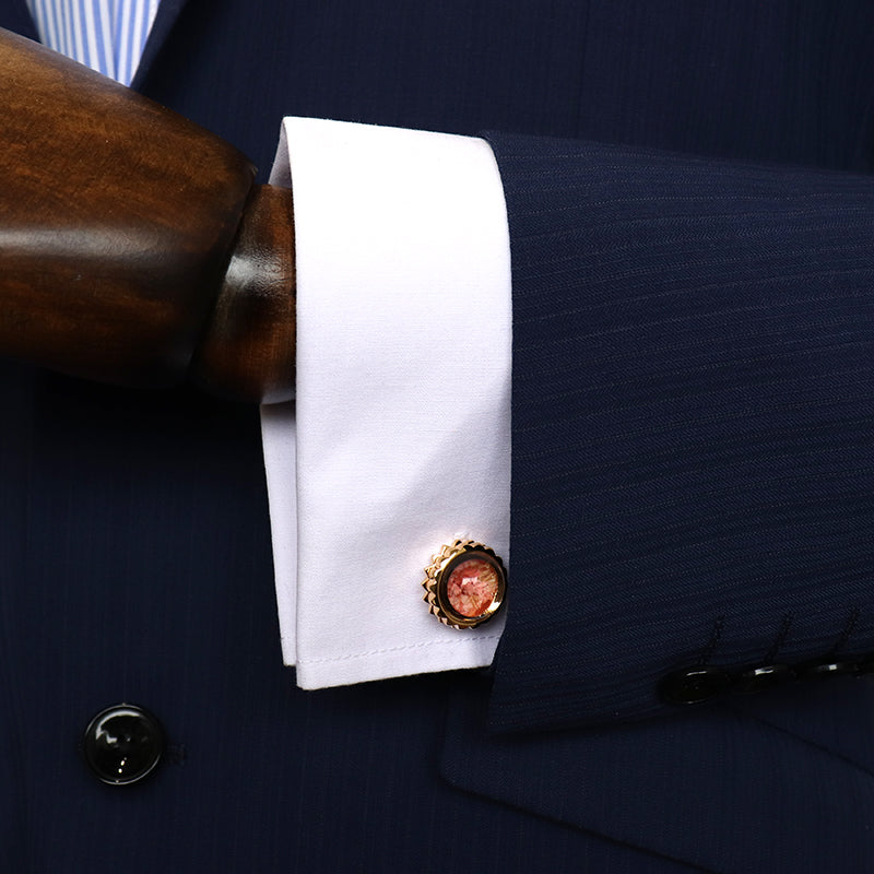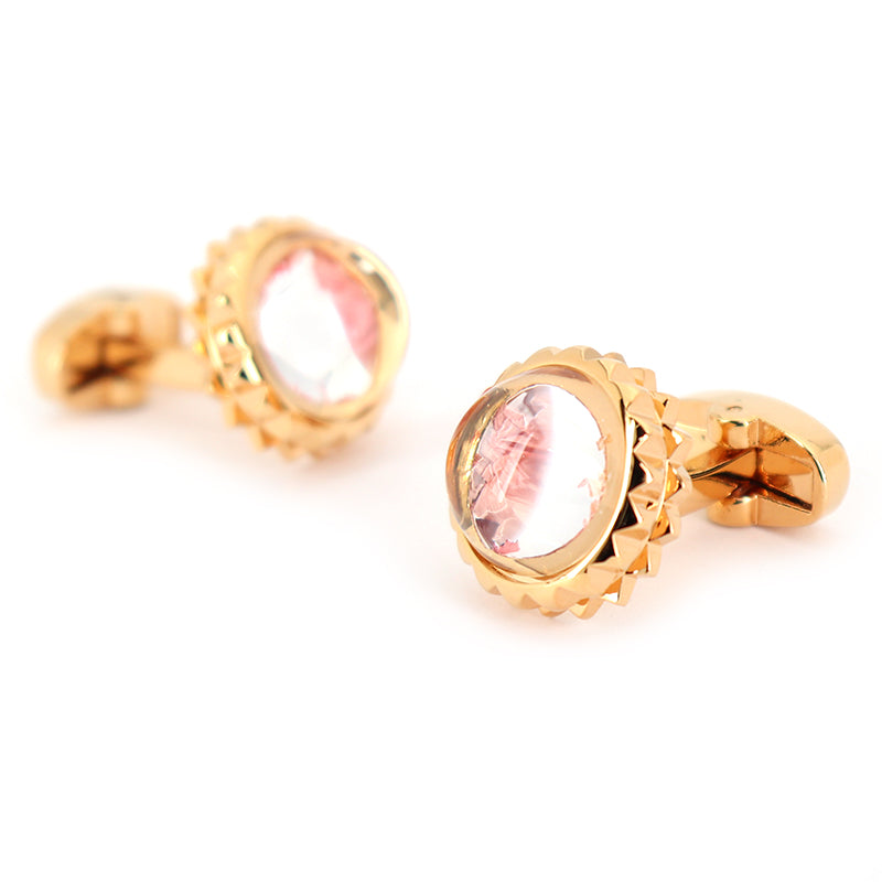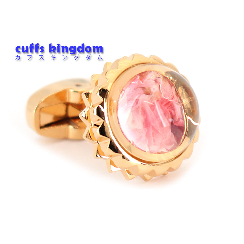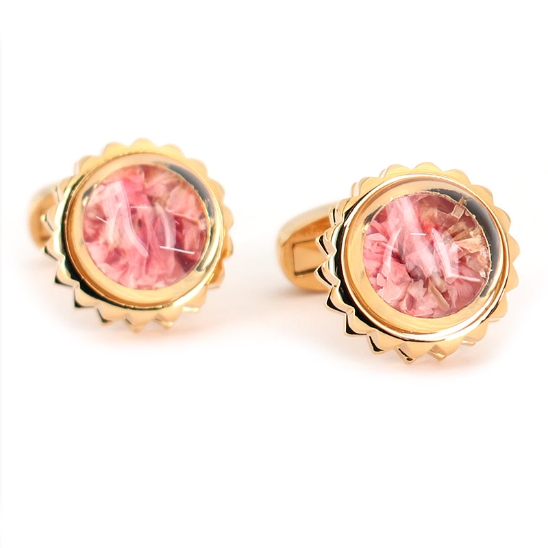 ピンクの花を入れ込んだ-ゴールド-円形-カフスボタン-ピンク-ゴールド-可愛い-円形-男女-カフリングス-プレゼント-人気-個性-おしゃれ-結婚式-カフス専門店