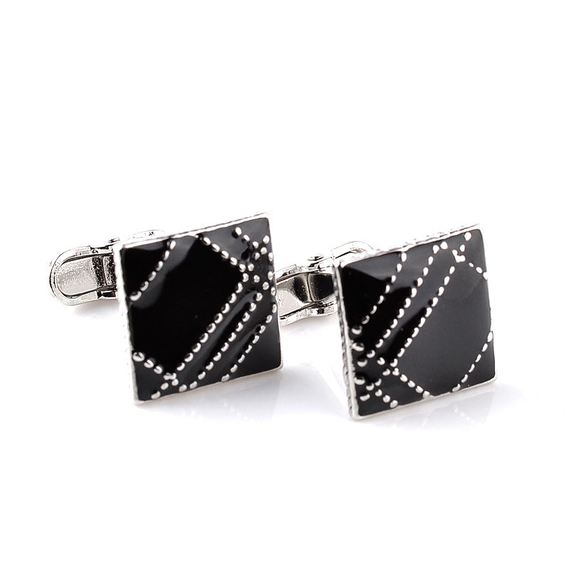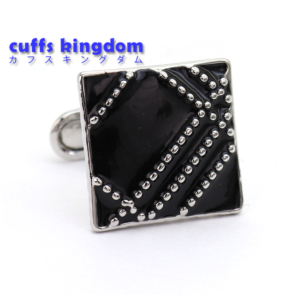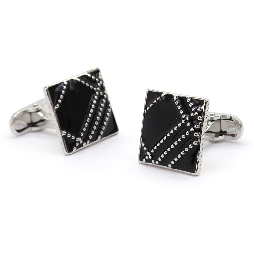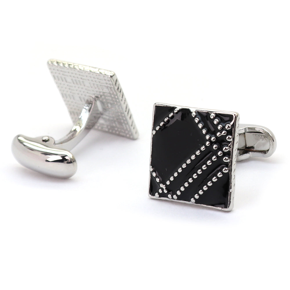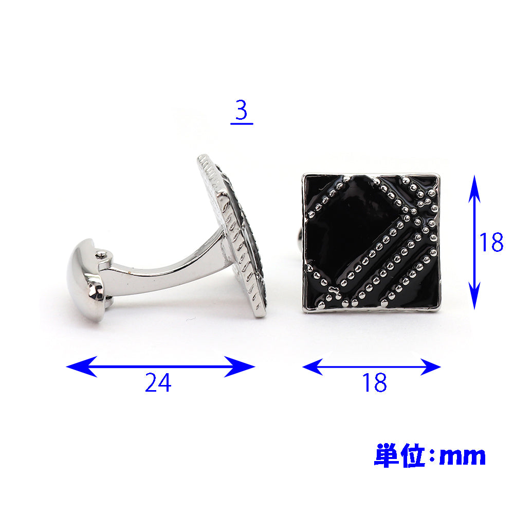 その独特なデザインは、正方形の形状に細かく並べられた銀色の点が施されており、モダンでありながらクラシックなスタイルを兼ね備えています。このカフスボタンは、フォーマルな装いに加える小さなアクセントとして、または日常的なビジネススタイルを格上げするアイテムとしても最適です。