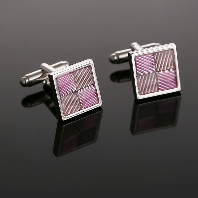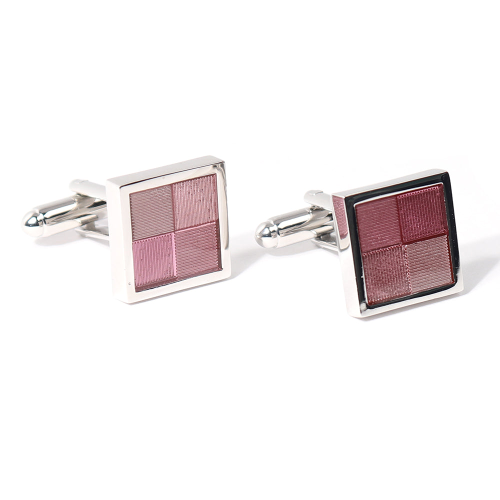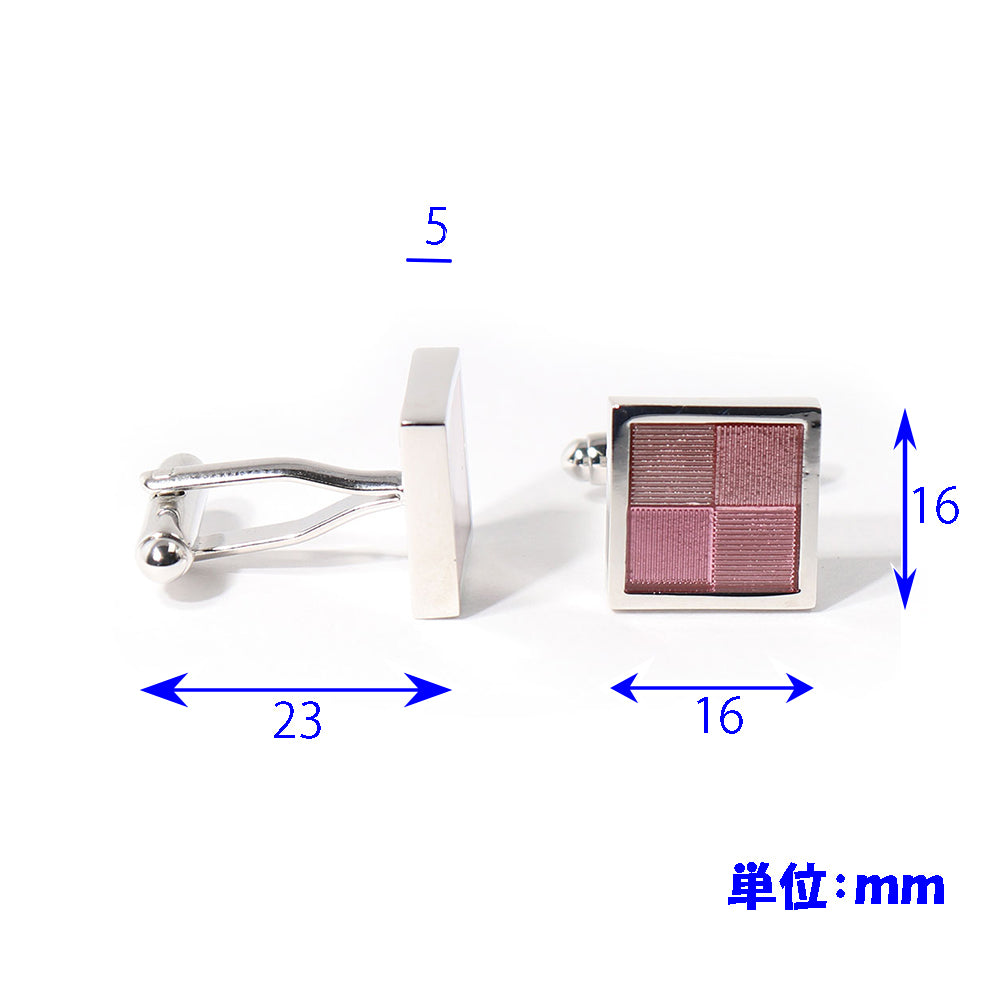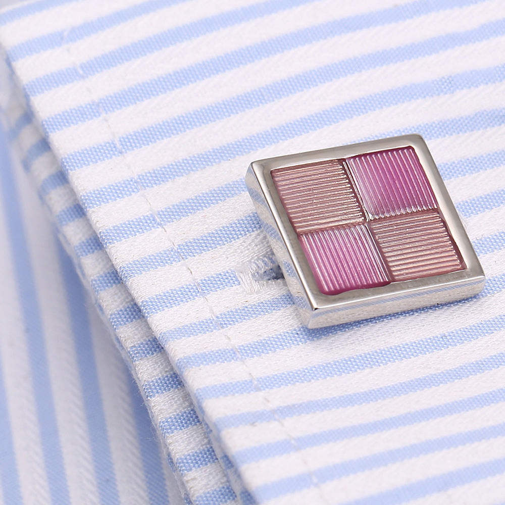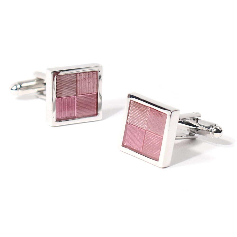 このカフスボタンは、洗練されたデザインと繊細な色使いが特徴です。四角いフレームにセットされたピンクのパネルは、光の角度によって異なる表情を見せ、着用者の個性を際立たせます。ビジネスシーンはもちろん、特別な日の装いにもぴったりです。