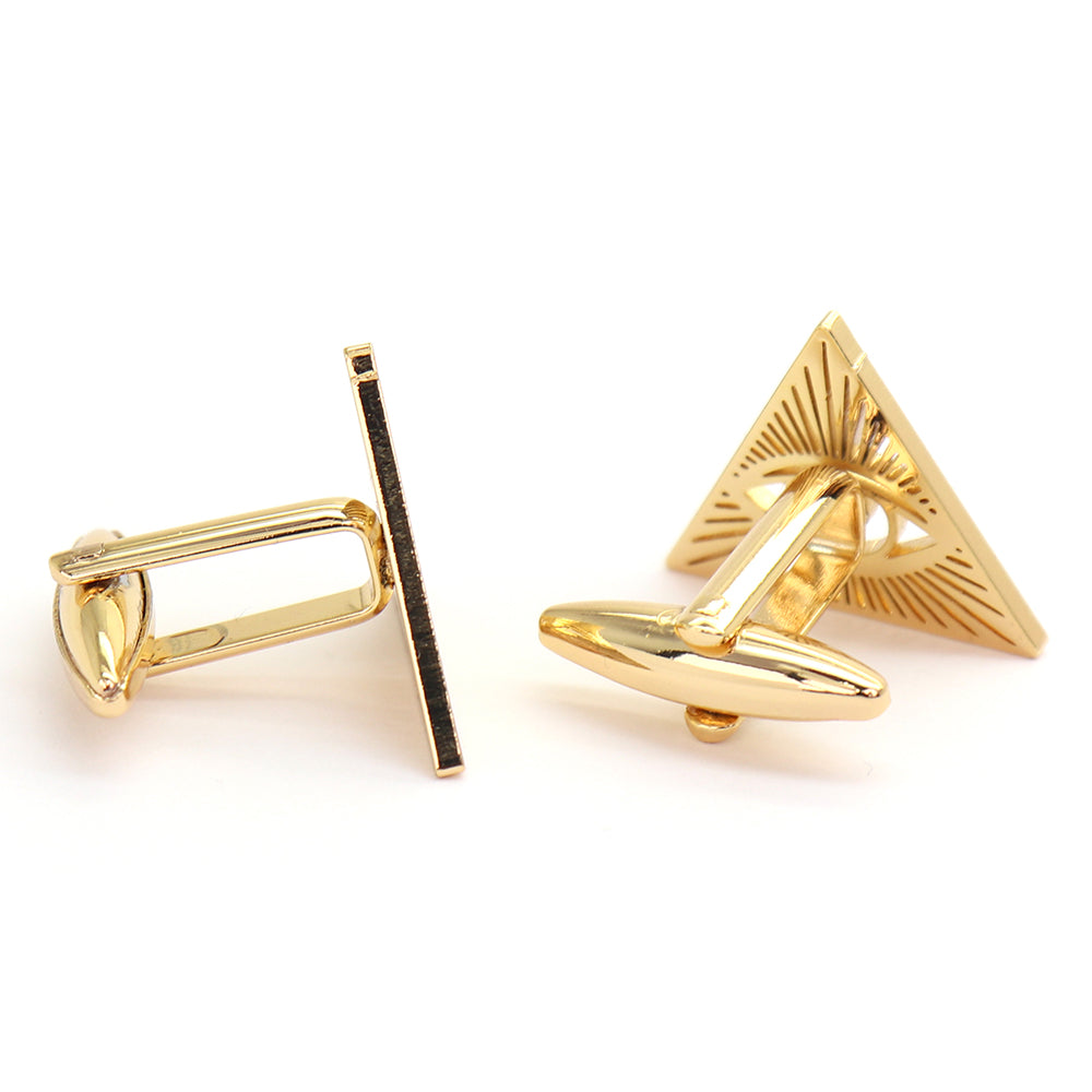 このカフスボタンは、その独特なデザインで注目を集めるアイテムです。三角形の形状に精巧に刻まれた目のモチーフは、古代のシンボルを現代的なスタイルで表現しています。このカフスボタンは、金色の輝きが高級感を演出し、どんなドレスシャツにも洗練されたアクセントを加えます。