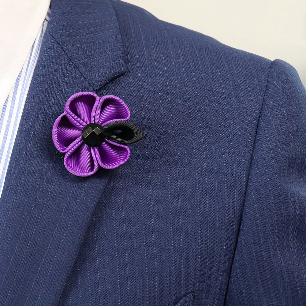 紫色に黒のワンポイト-お花のラベルピン-紫色-工芸-コサージュ-ブローチ-男女-プレゼント-おしゃれ-スーツ
