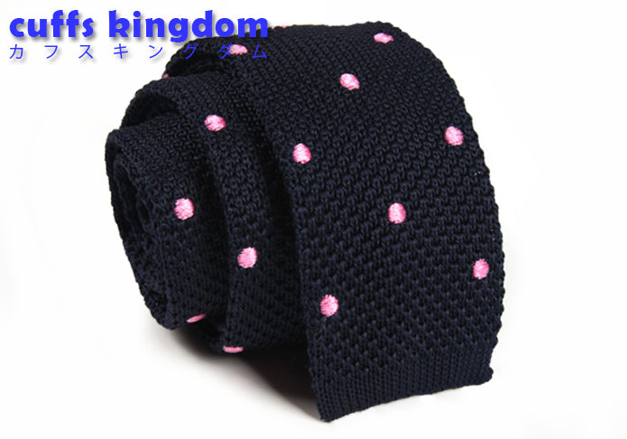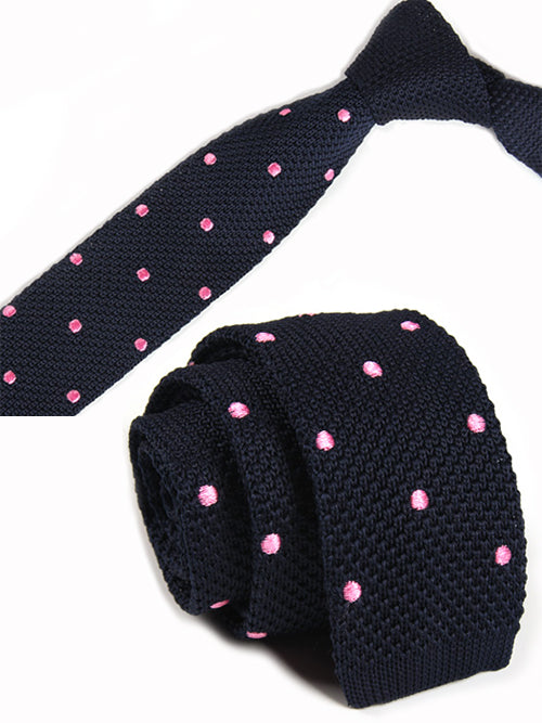 紺地-丸い-ピンク-ドット-刺-入り-ニットタイ-模様-編みタイプ-スタイリッシュ系-シンプル-クール-男女-祝-おしゃれ-かわいい-結婚式-カジュアル-スーツ-人気-プレゼント-ギフト-入園式-入学式-成人式