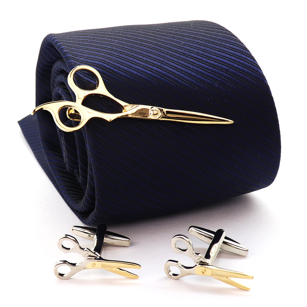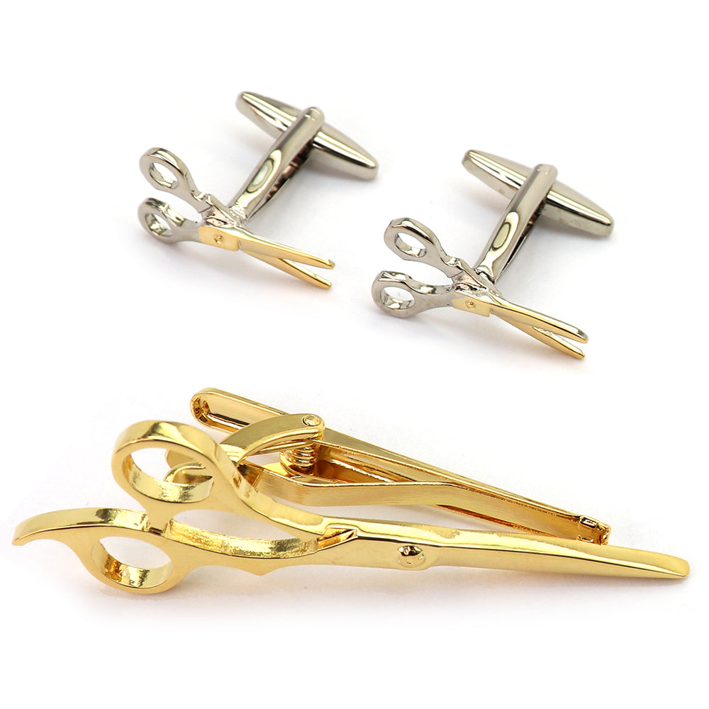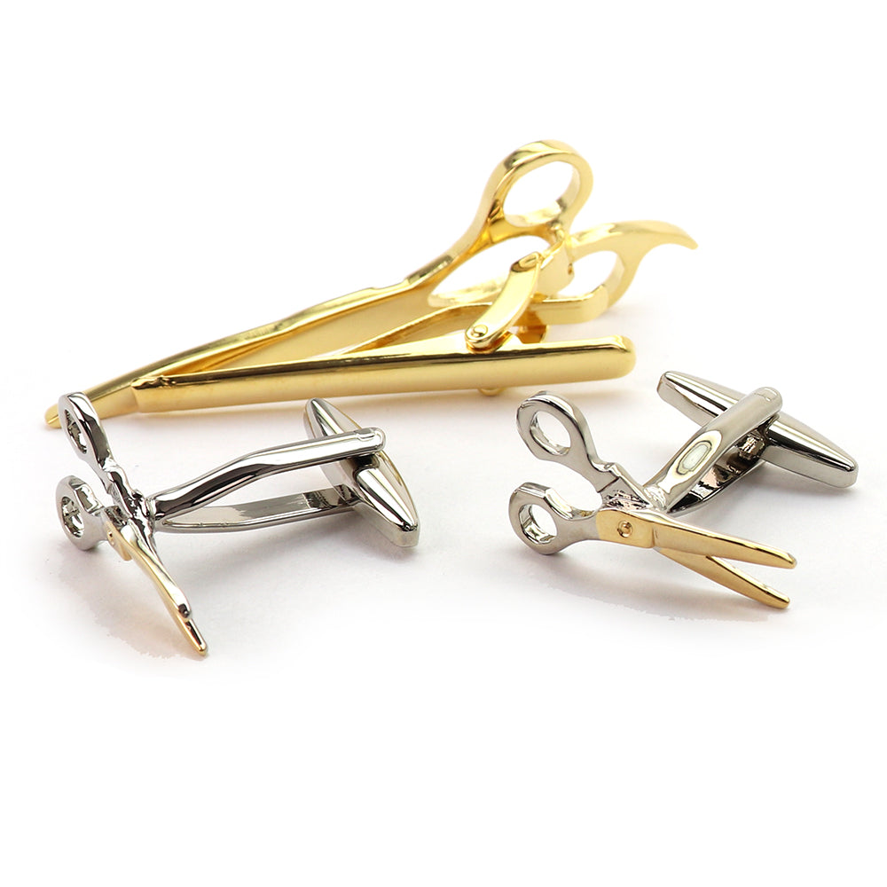このセットは、洗練されたデザインと機能性を兼ね備えたアクセサリーです。ユニークなハサミモチーフのカフスボタンとタイピンで、その独特な形状が注目を集めます。ゴールドとシルバーの2色展開で、どんなスーツにもマッチし、フォーマルな場面での印象を一層引き立てます。