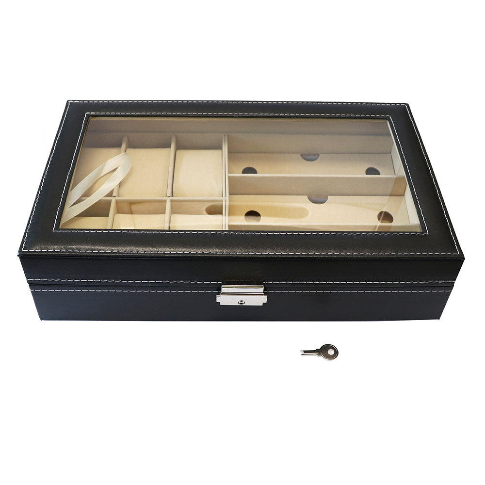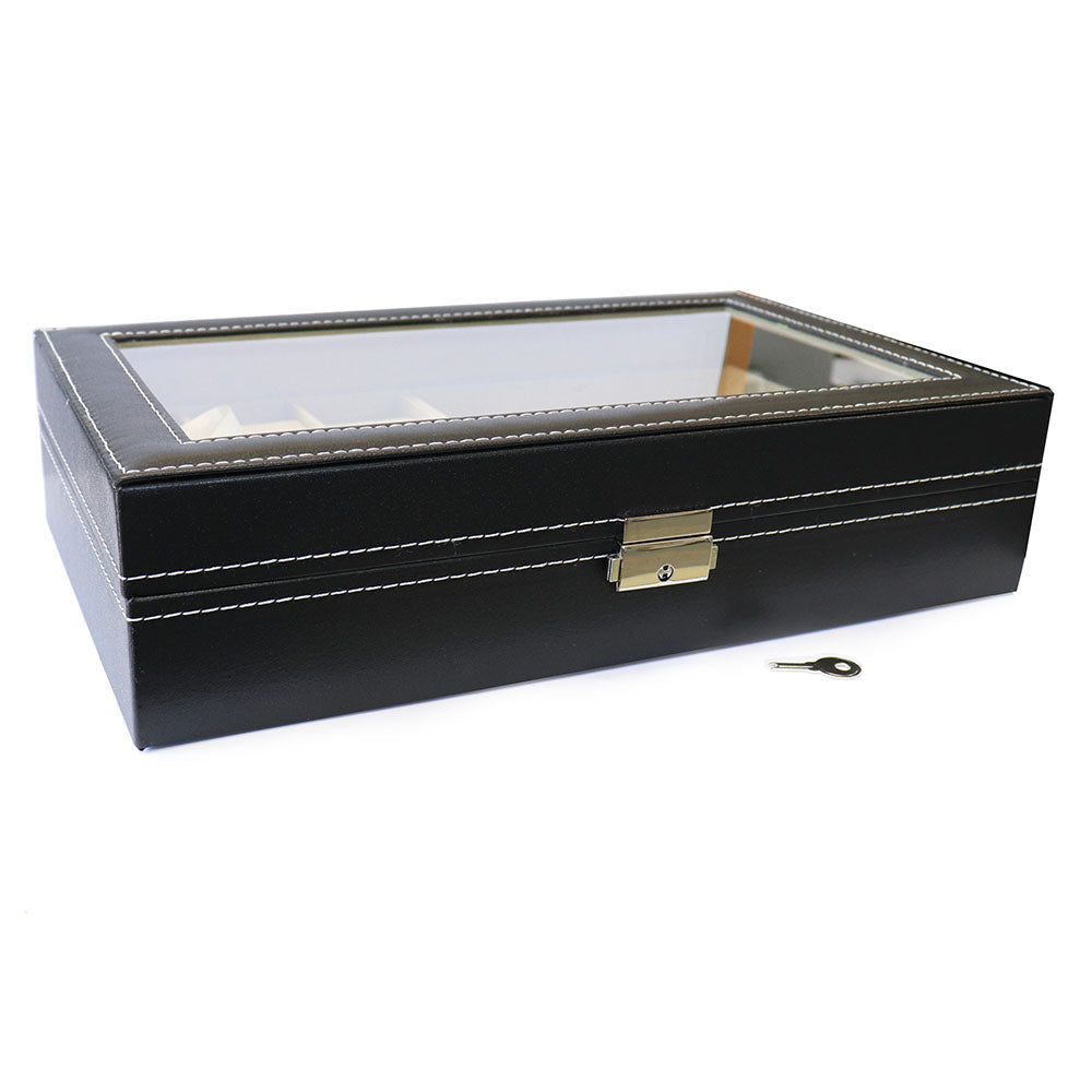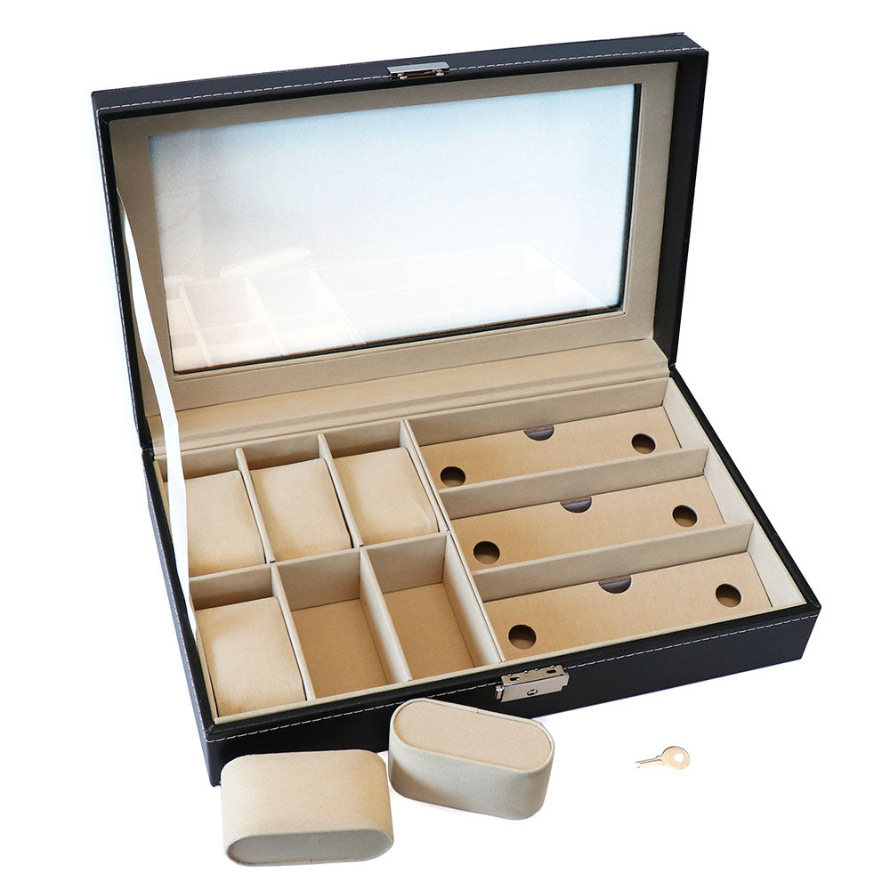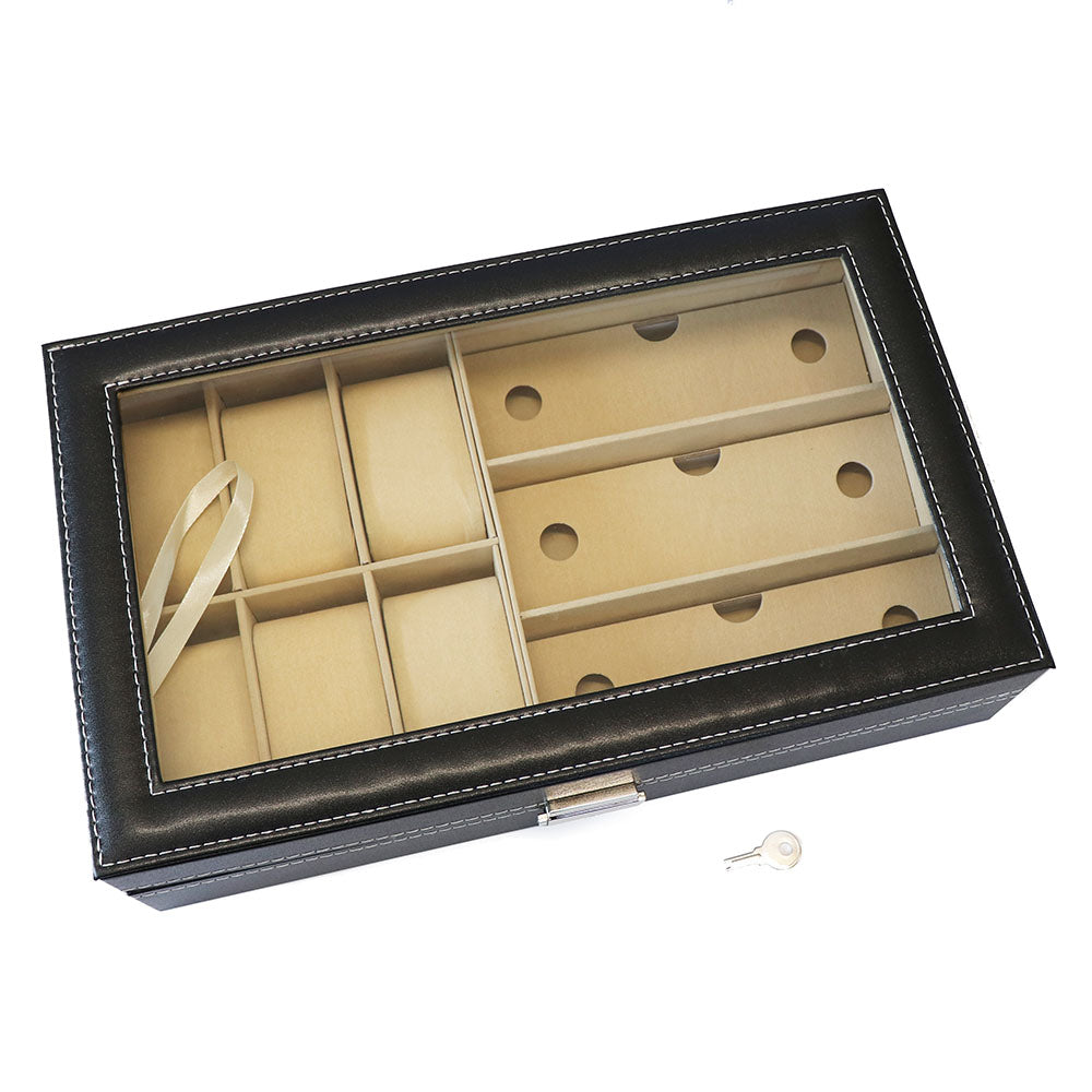 腕時計 + めがね 収納 PU ボックス 鍵付き アクリル天板【ブラック】裏地 柔らか 素材 ロック付き コレクション 高品質 高級時計 保管 ケース メンズ 父の日 誕プレ 収集 飾る インテリア 安心 サングラス