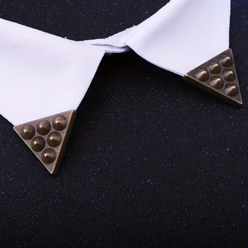 このカラーピンは、洗練されたデザインと機能性を兼ね備えたアクセサリーです。この商品は、シャツの襟を美しく整えるために設計されており、シンプルながらも目を引くブロンズ色の金属製の先端が特徴です。各先端には精巧に配置された金属の突起があり、これが洗練された印象を与えます。