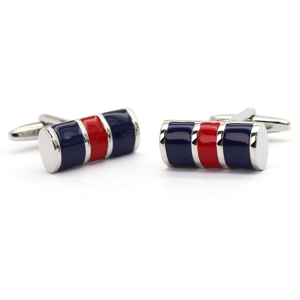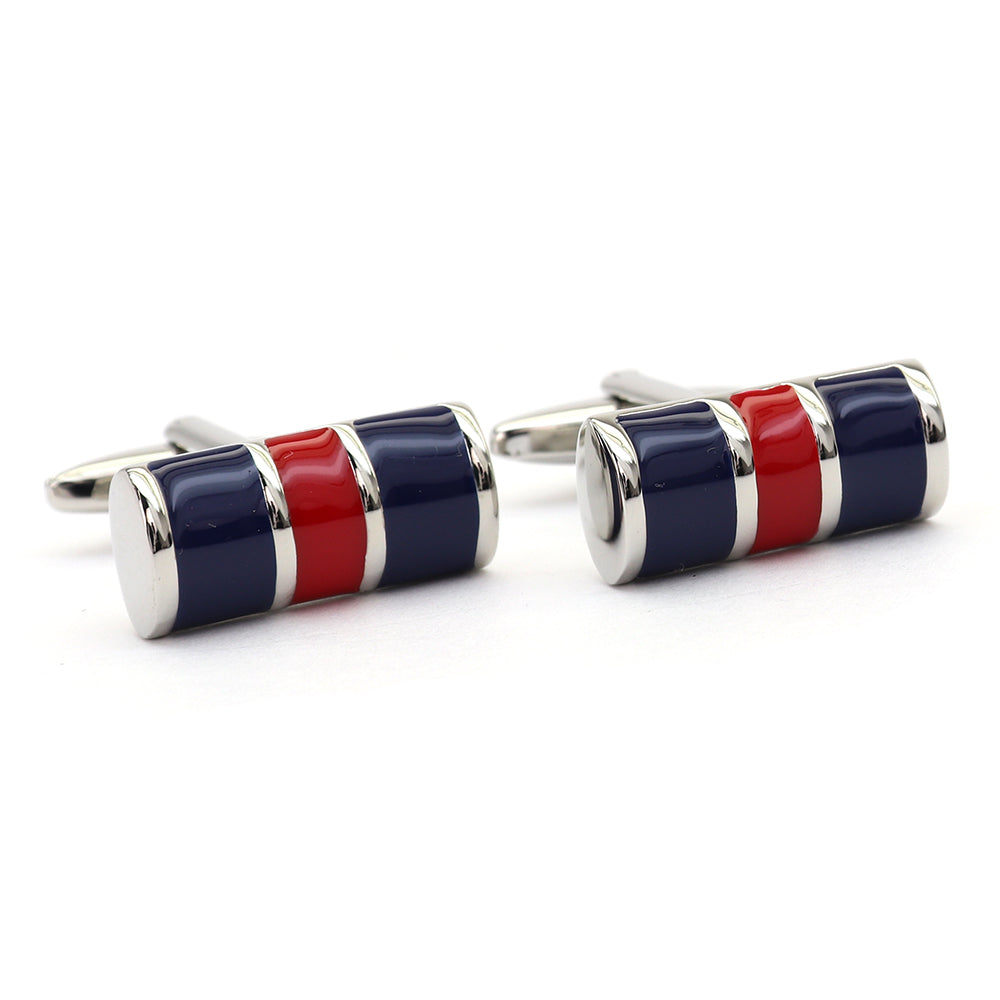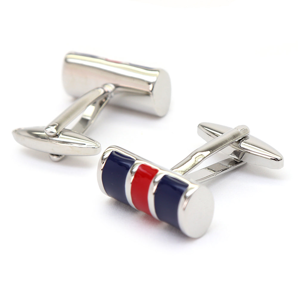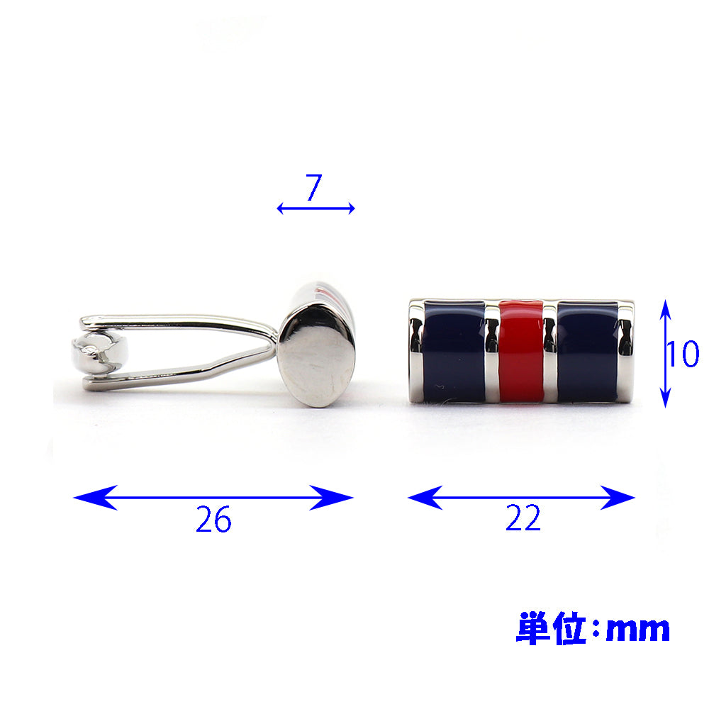 このカフスボタンは、洗練されたデザインと鮮やかな色使いが特徴です。青、赤の二色がバランス良く配置されており、どんなスーツにも映えるアクセントとなるでしょう。シンプルながらも目を引くこのデザインは、ビジネスシーンはもちろん、特別な日の装いにもぴったりです。