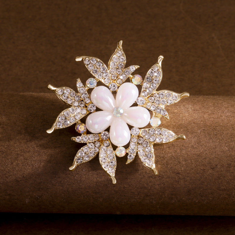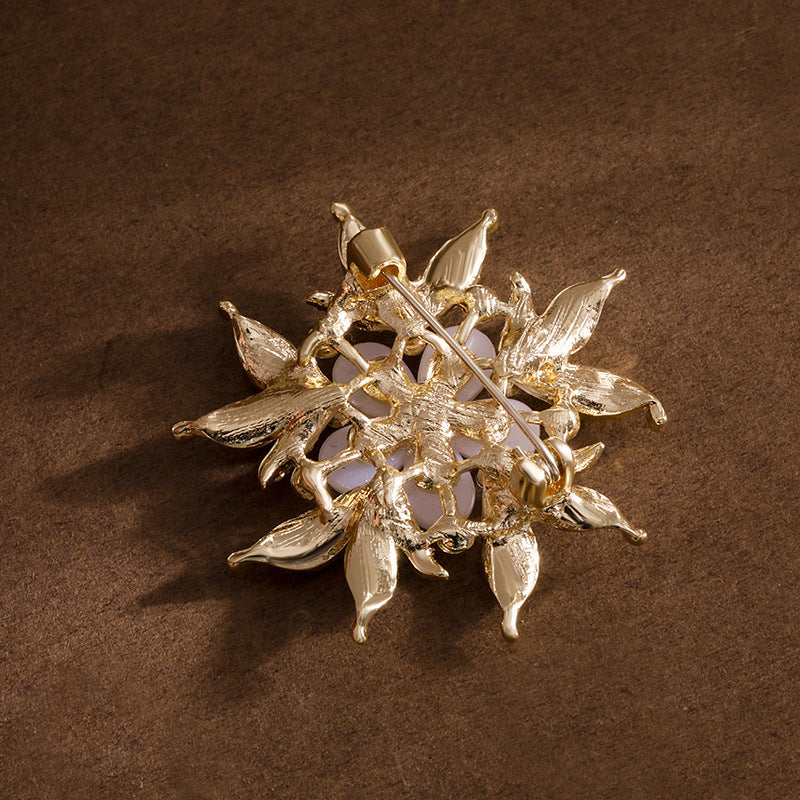 このブローチは、華やかでエレガントなデザインが特徴です。中心に配置されたパール風の花びらが、上品な輝きを放ち、周囲のクリスタルがその美しさを一層引き立てます。特別なイベントやパーティー、フォーマルな場面でのアクセントとして最適です。シンプルな装いにこのブローチを加えるだけで、一気に華やかさが増し、洗練された印象を与えます。贈り物としても喜ばれること間違いなしの一品です。