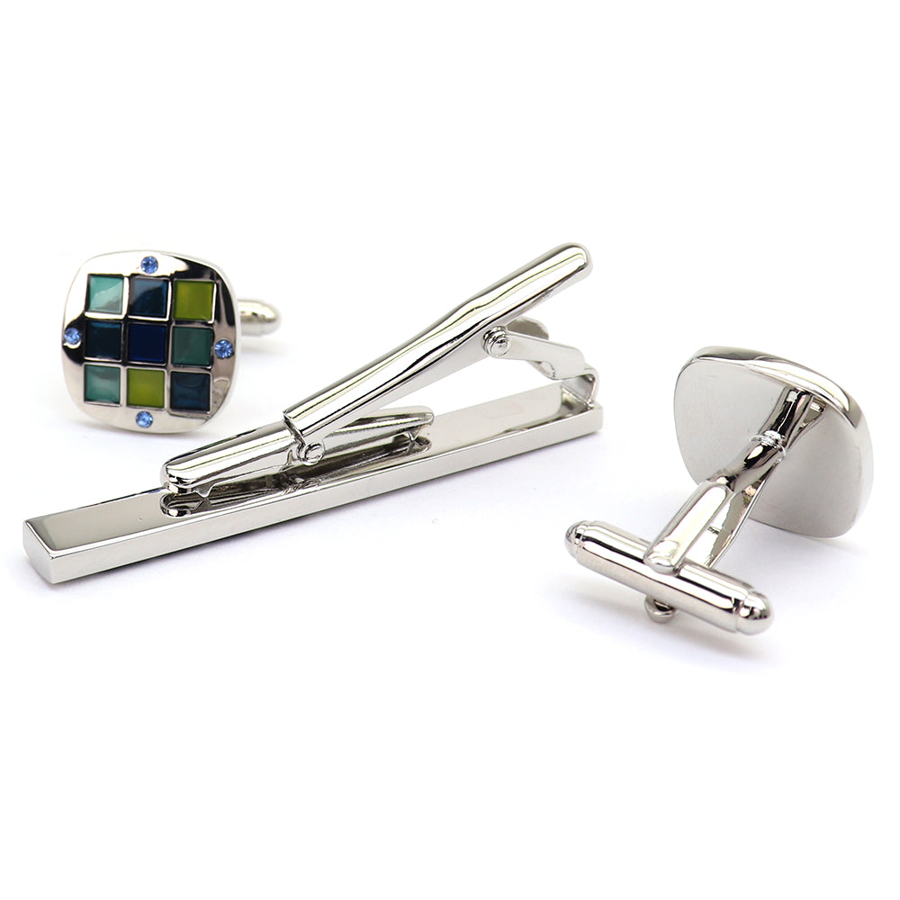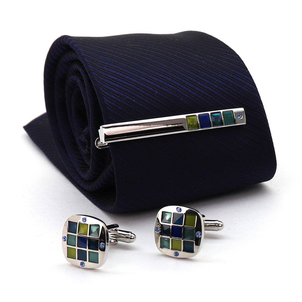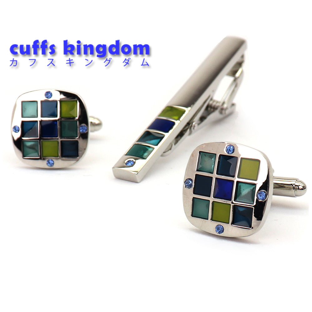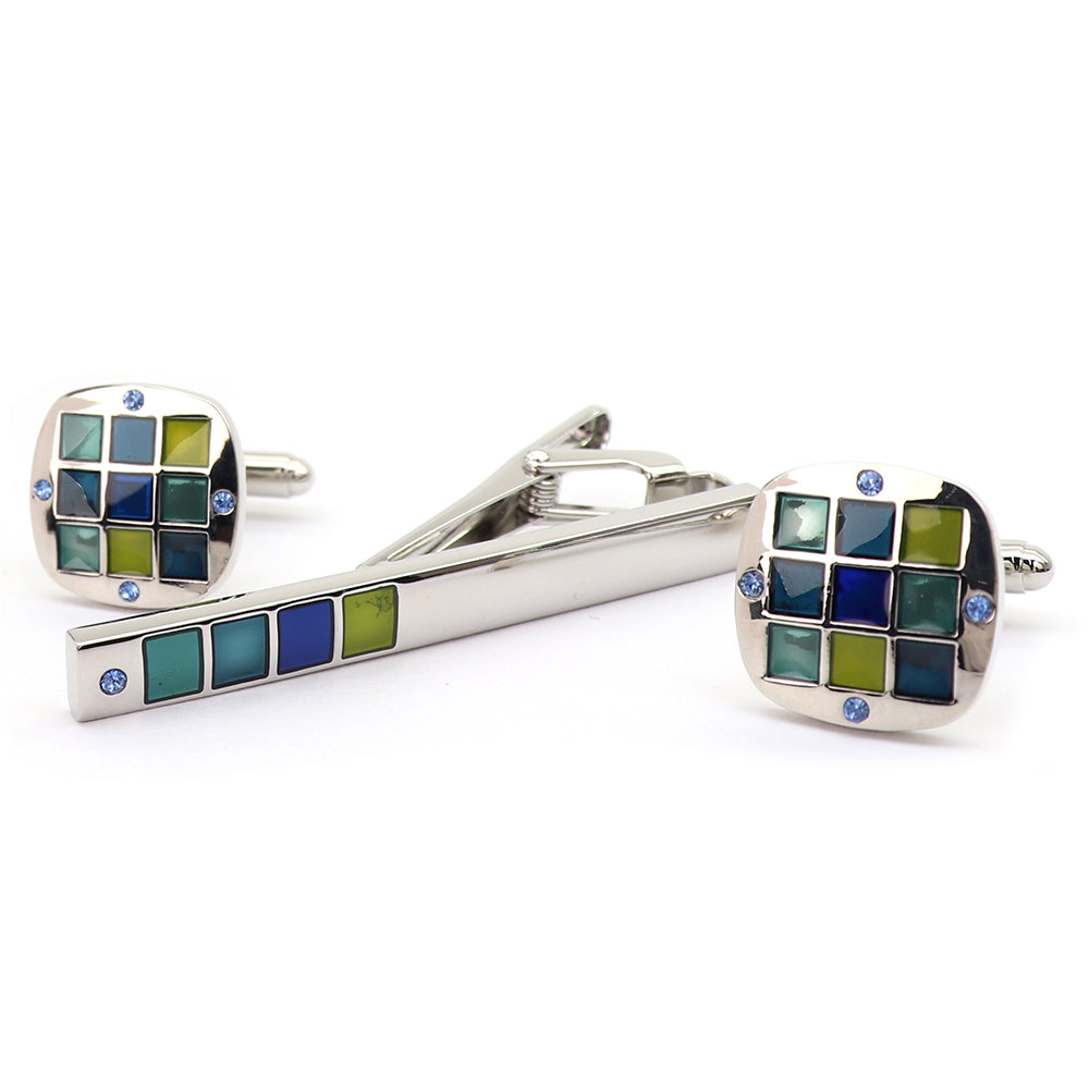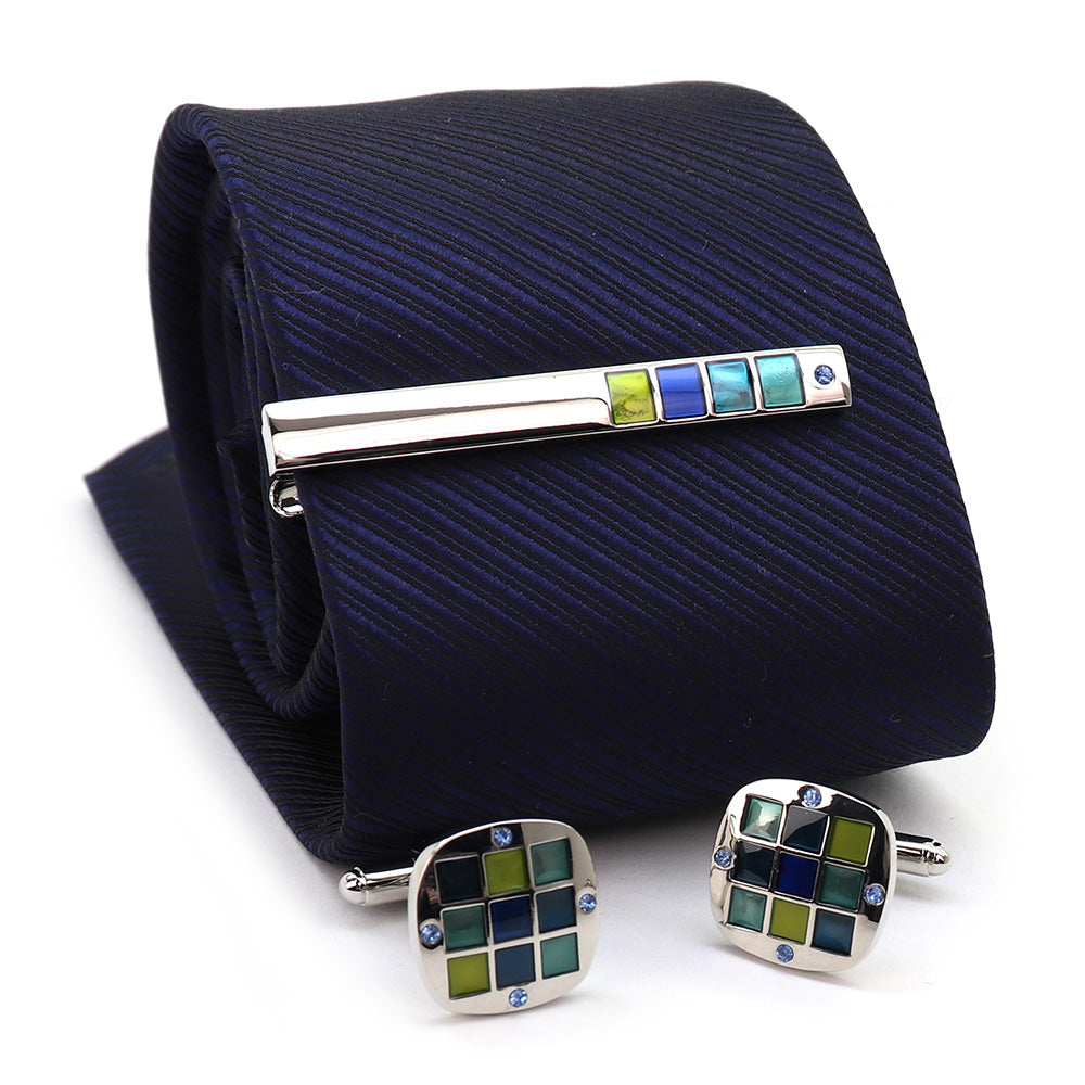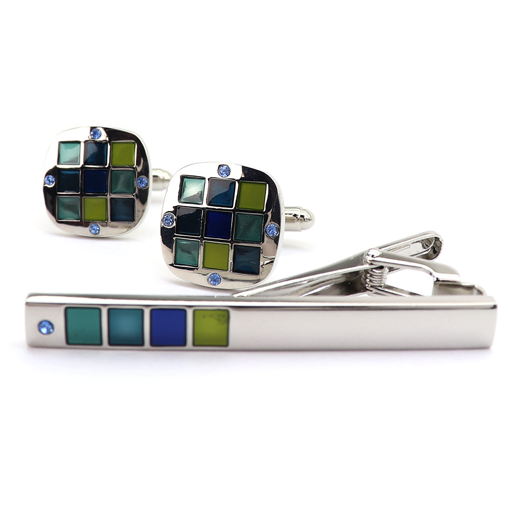 このセットは、洗練されたデザインと鮮やかな色彩が特徴です。シルバーのベースに、青と緑の色合いが組み合わさったタイル模様が施されており、小さな青い宝石がアクセントとして散りばめられています。カフスボタンとタイピンのデザインが統一されているため、ビジネスシーンでのコーディネートが一層引き立ちます。