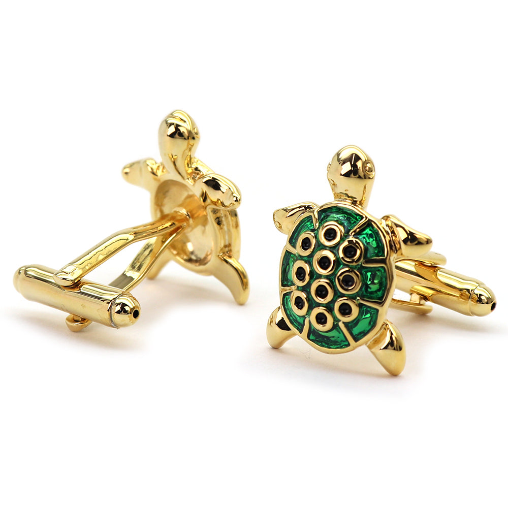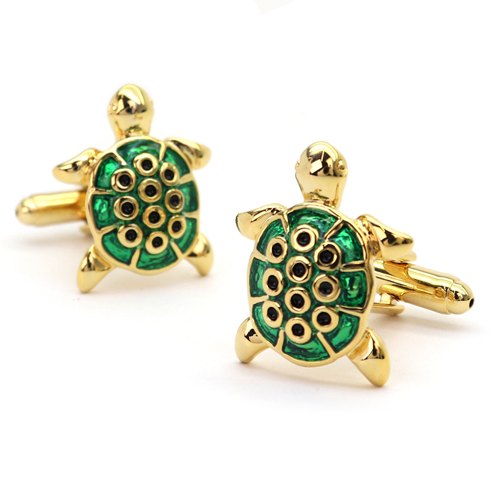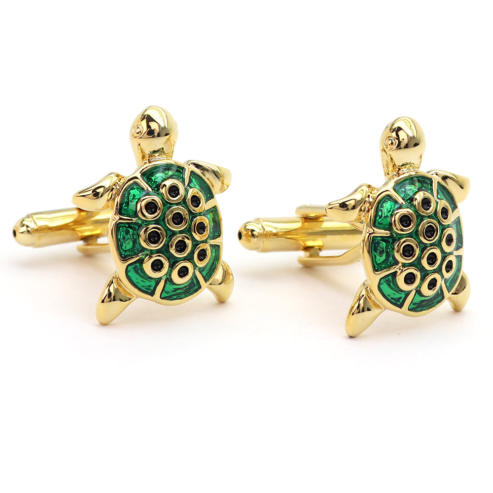 この美しいカメ型のカフスボタンは、独特なデザインと鮮やかな色彩が特徴です。ゴールドのベースに緑色のアクセントが施されており、その上に黒い点が配置されています。この組み合わせが、洗練された印象を与え、どんなドレスシャツにも華やかなアクセントを加えます。