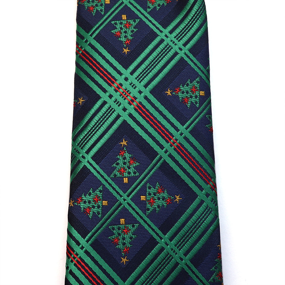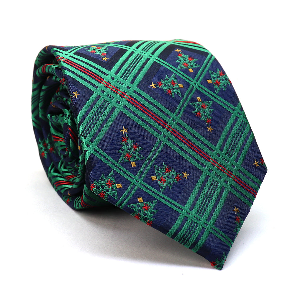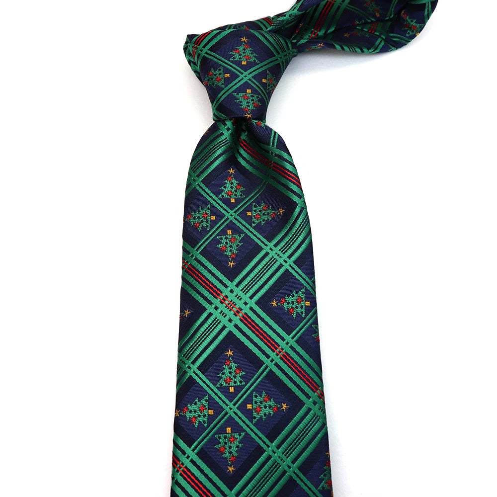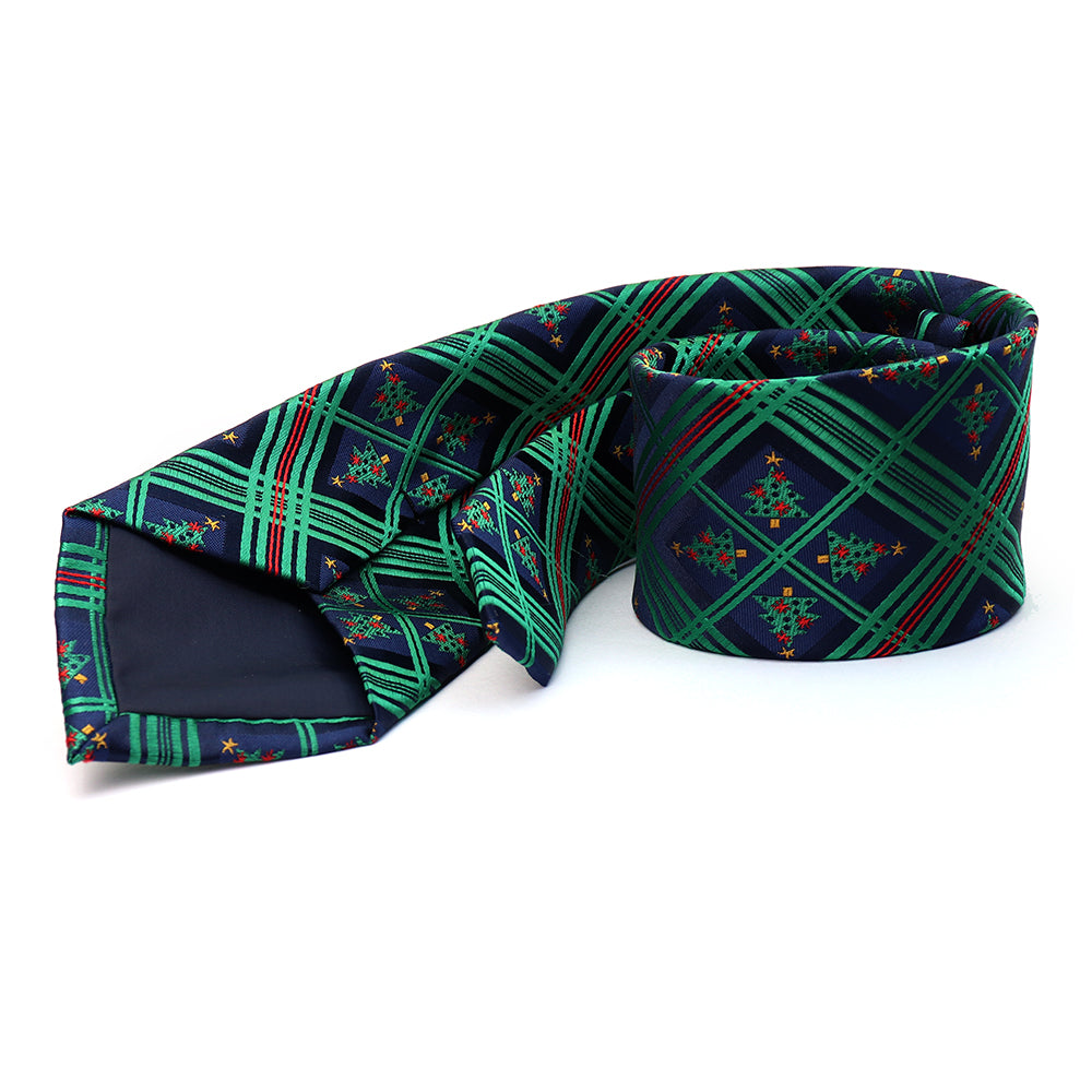 クリスマスイベントやパーティーにぴったりのこのネクタイは、特別な日の装いを華やかに彩ります。深みのあるネイビーベースに鮮やかなグリーンとレッドの格子模様が交差し、その上に散りばめられたクリスマスツリーのモチーフが、季節感を演出しています。
