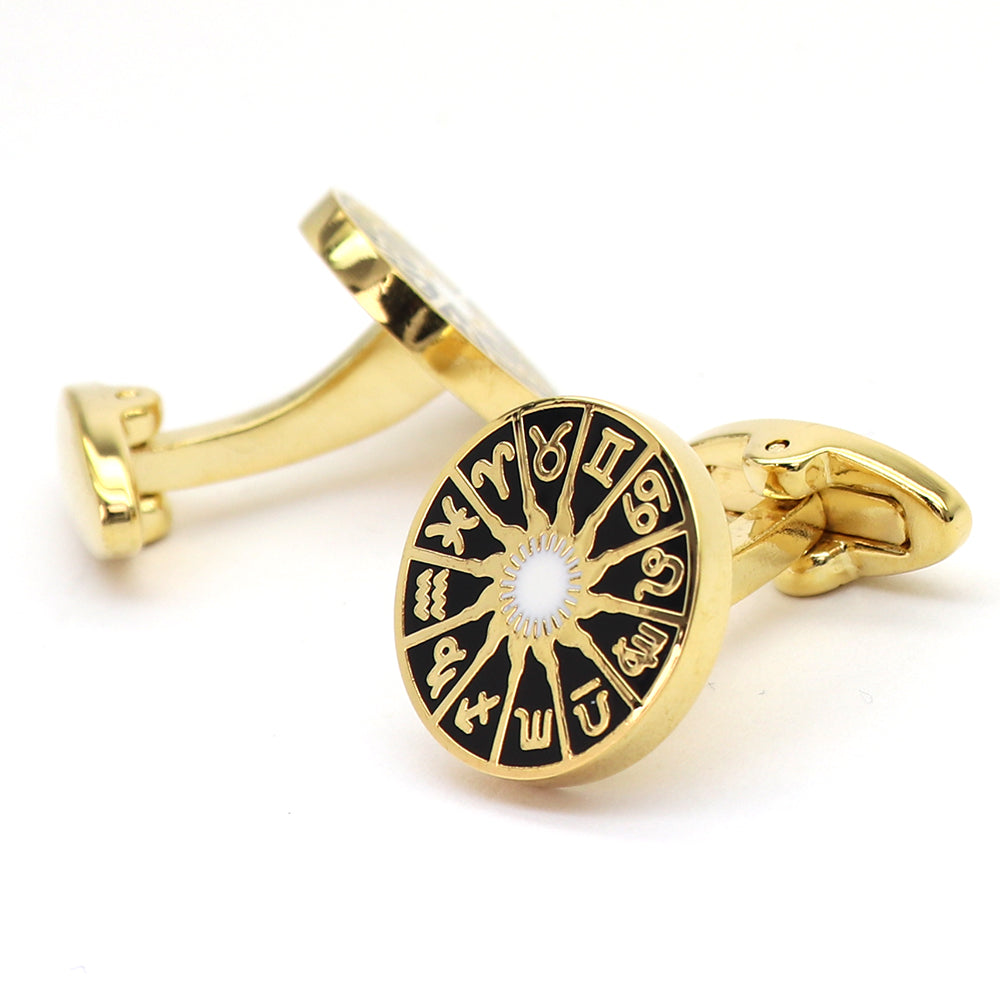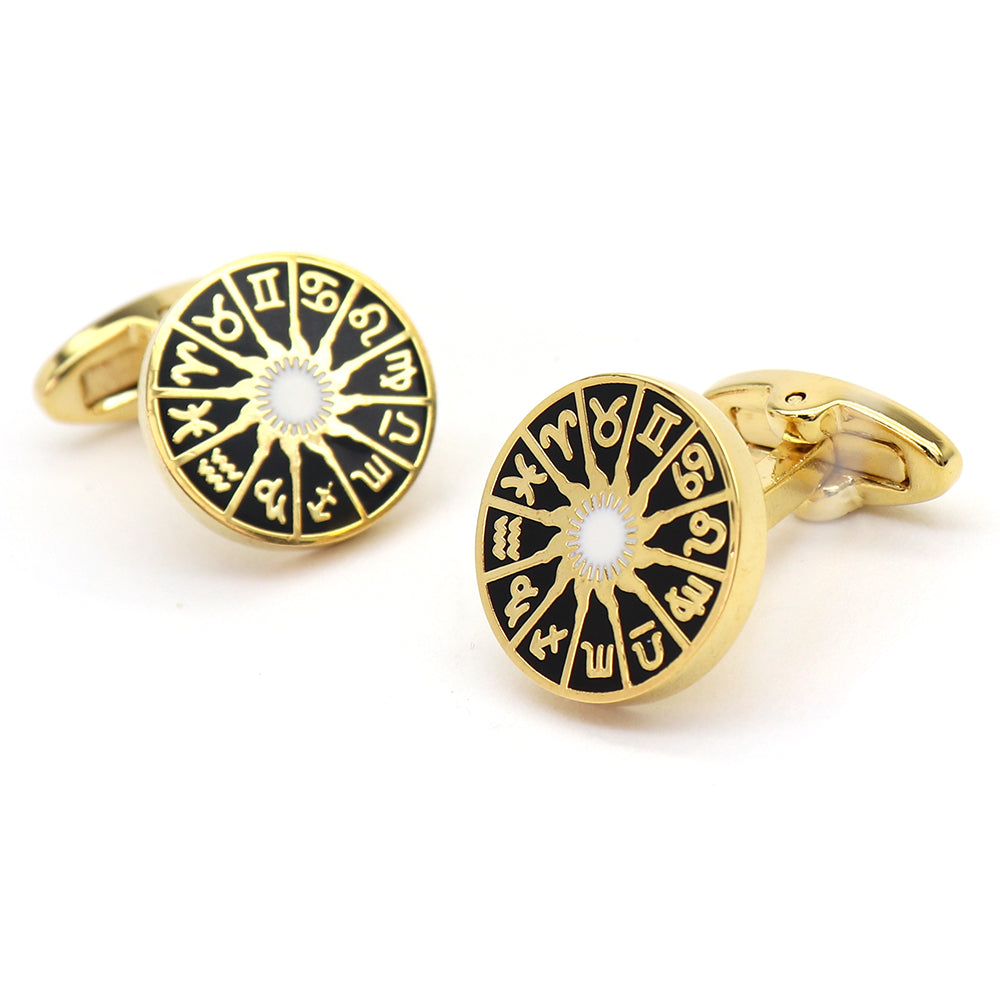 このカフスボタンは、洗練されたデザインと個性を兼ね備えたアクセサリーです。黒と金色のコントラストが美しく、中央には太陽を象徴するデザインが施されています。周囲には12星座のシンボルが配されており、ファッションに深みと話題性を加えることができます。